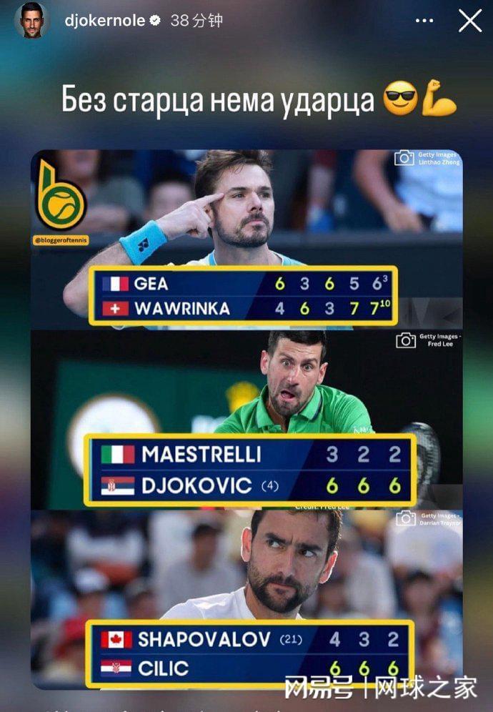 其它场次:两届卫冕冠军辛纳以6-1 6-4 6-2横扫本土球员达克沃斯;十冠王德约科维奇以6-3 6-2 6-2轻取意大利资格赛球员马埃斯特雷利。赛后,德约科维奇还在个人社交媒体分享了自己与瓦林卡、西里奇三位85后老兵的战报。当天出战的瓦林卡决胜盘抢十险胜法国资格赛球员热亚;西里奇三盘横扫了加拿大名将沙波瓦洛夫。弗里茨、马哈奇、奎因、穆塞蒂、谢尔顿、鲁德等球员也纷纷获胜,晋级第三轮。
